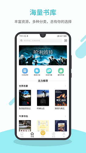 该软件每天推荐英文经典读物和英语图书资讯内容,丰富的英文书籍和双语对照。