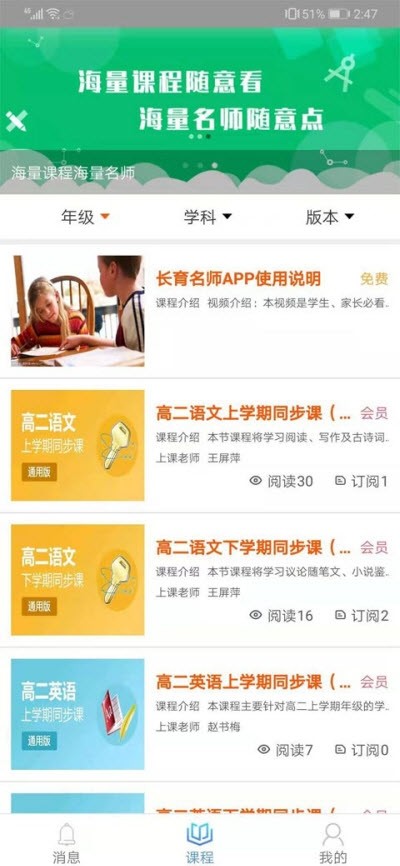 为小、初、高不同年级的学生提供在线名师辅导的平台,用户下载应用、注册登录账号、开通会员后即可免费观看所有年级的课程视频。用户可关注自己感兴趣的讲师,该讲师发布新课程视频时有消息提醒。