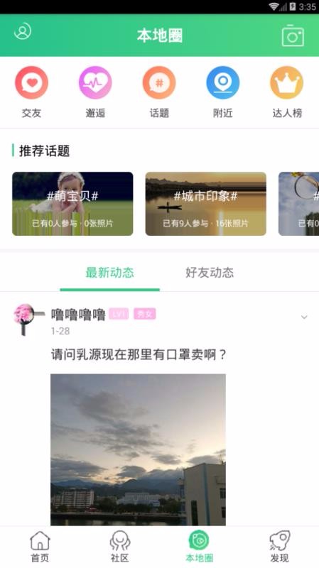 本地圈动态内容多种多样,还有专属话题推荐,可直接参与话题,与网友线上互动。