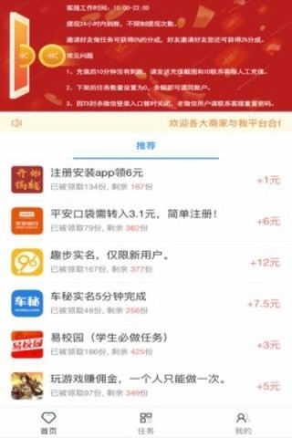 随时在首页看到各种入口的最新资源,可以抢单可以推广的综合平台。