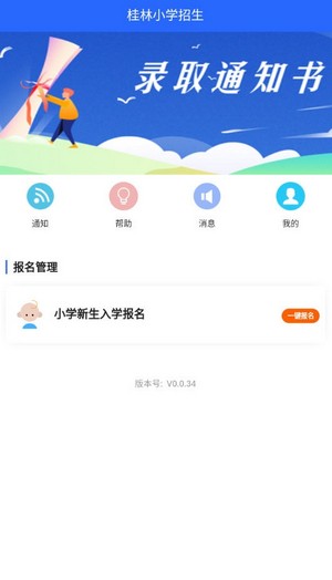 桂林小学招生报名流程:登录后,点击主界面的小学新生入学报名的一键报名按钮,进入报名页面。