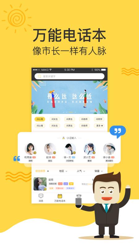 【电话本】:这里可以找到任何行业人士,比如:律师、医生、翻译、公安、老师、美丽的小姐姐、陪你聊天的小哥哥、北大学生、明星等等,遇到问题可以马上搜索并得到解答,从此你变得像“市长”一样有人脉。同时,也可以为自己自定义标签,成为解答人,为他人答疑解惑赚取收益。
