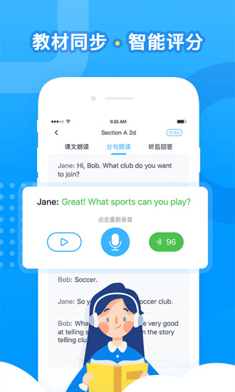听说练习:包含课文朗读、分句跟读和听后回答,可以根据学生的录音实时给出测评得分。
