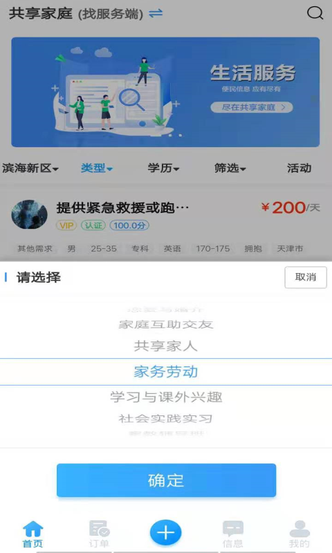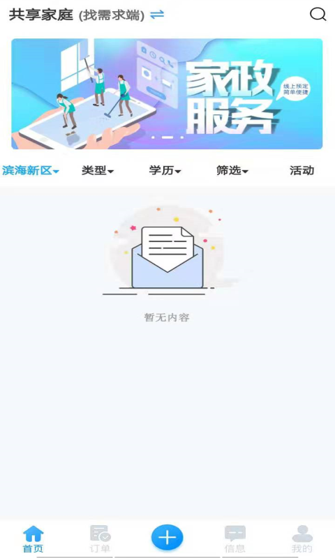 共享家庭app是一个可以发布招聘和应聘信息的服务平台,共享家庭软件主要包括以下内容:家政、社交、教育、医疗、就业、公益活动、文体活动等的中介服务。用户可以任意切换招聘者和应聘者的身份。具体供需模块请参考系统首页的“类型”模块,活动则只能被地区所筛选,无更多筛选条件。