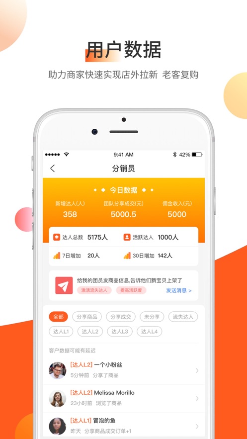3、客户管理:客户数据系统化管理,帮商家了解客户总数、回头客、新增与流失数;配置客户对商品、店铺、拍单的数据分析,轻松调整店铺经营策略。