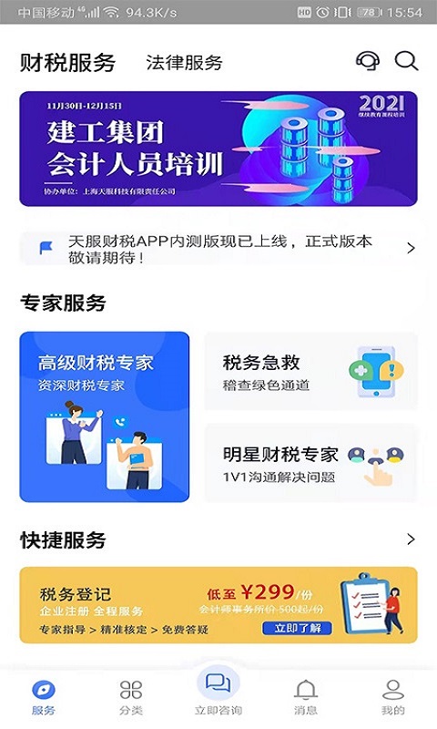 天服云服务平台官方版是一款专业的税务服务软件,为广大用户们提供了各种相关的服务内容,包含咨询、培训、协同等,为各种企业解决各种税务问题,还能解答用户们的所有相关疑惑.