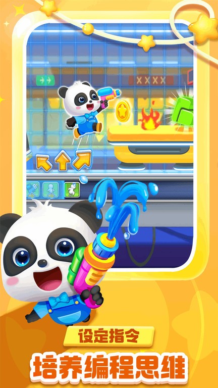 能源芯片被藏进“程序世界”中,城市陷入混乱。想夺回芯片,需经过喷射的火焰、狭窄的道路……只有运用编程思维,输入正确指令,才能清除障碍。正义的宝宝,接受挑战吧:先有序输入水枪、前进、蹲下等指令,再启动运行按钮,yes!火焰扑灭,顺利移动!
