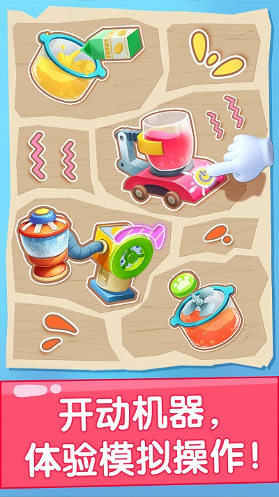 在加热容器里融化糖块,用混合器将果汁汽水融合、在灌装机上将果汁装好……神奇好玩的机器世界,等你大显身手!