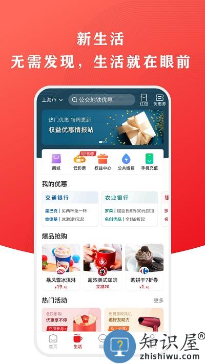 2.发现频道升级为生活频道,根据绑卡主动展示可享优惠,提供推荐、商家、商品、权益等内容;