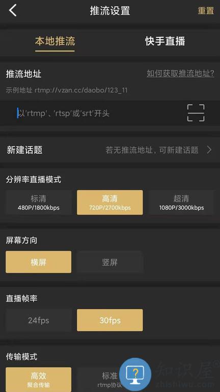 ·设置【推流地址】,在根据自己实际情况来配置参数(直播分辨率、屏幕分享、直播帧率、传输模式);