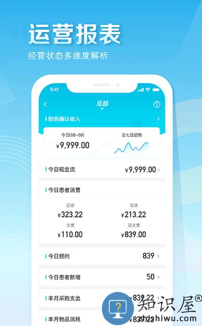拥有运营报表版块,用户在这里可以看到诊所今日营业收入和现金流等信息