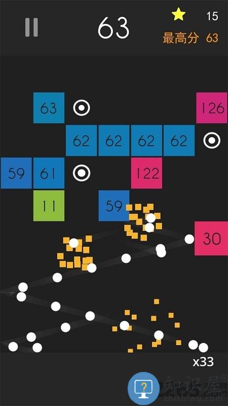 沿瞄准线弹射到屏幕中间带有各种数字的方块上,让圆球不断的在多个方块、墙壁之间来回反弹,直到圆球反弹到地面。当圆球与方块每碰撞一次,方块上的数字就会减少一,直到方块的数字变为零时,该方块就会消失掉。所有圆球回到地面后,上方的所有方块会往下移动一格,玩家需要选择发射时的瞄准路线,并计算反弹路线,力求让圆球在方块之间尽可能多的反弹,在方块移动到地面之前,尽快的消除掉屏幕中出现的方块。