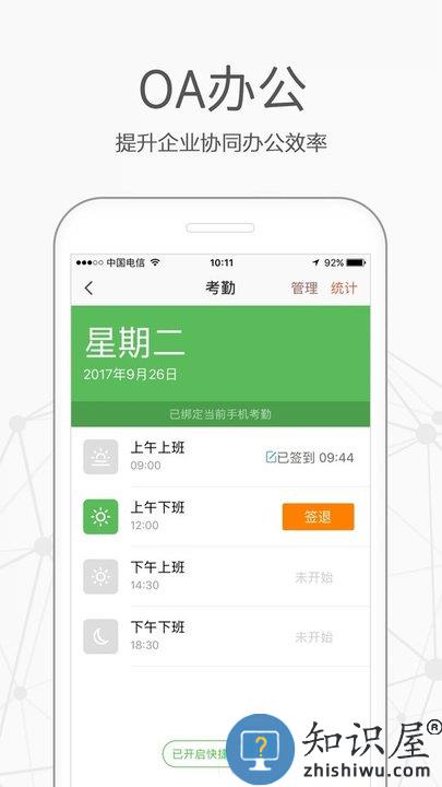 机考勤、流程审批、工作汇报、移动报销、任务管理、企业云盘、企业通讯录、在线聊天等丰富的功能