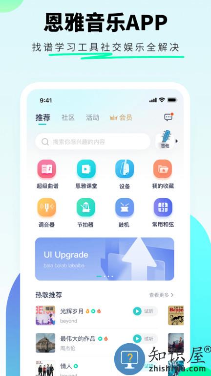 3、在软件首页,用户可以看到各种推荐的歌曲,商城,超级曲谱,恩雅课堂,设备,调音器,节拍器,常用和弦等,还能查看社区和活动页面