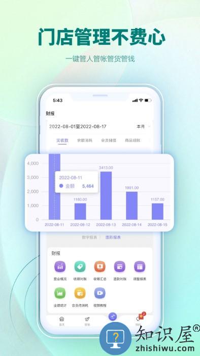 2.2265手机随时查看运营情况、财务报表、每日营收、会员储值、店务管理等多种经营状况尽在掌控。