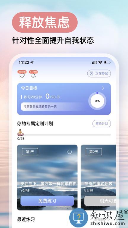 这款app是帮助用户们缓解压力、改善专注度的冥想应用,正念冥想app通过宁静身心和压力管理的冥想技术,聚集放松减压与改善失眠的冥想教程,旨在做你的冥想老师。