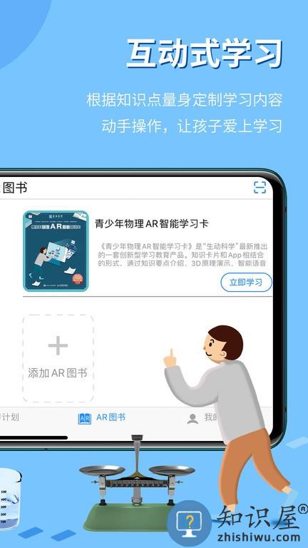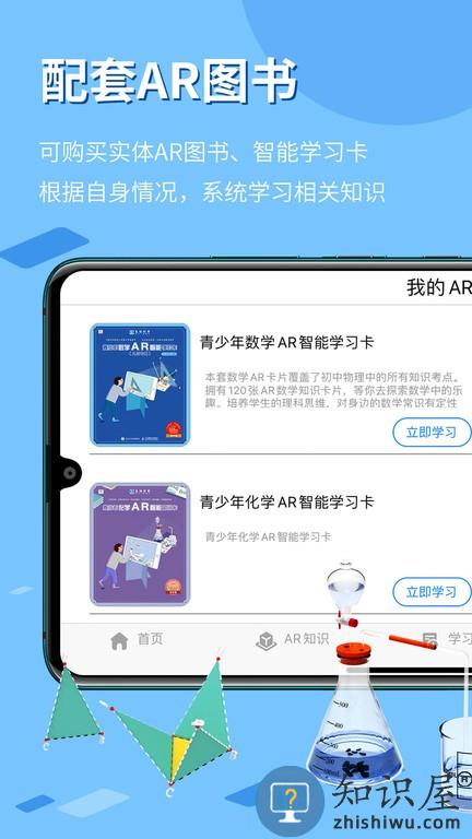 1、下载进入生动科学AR app,然后点击下方的:AR知识,可以进行学习;
