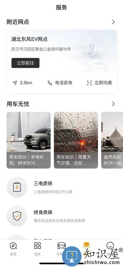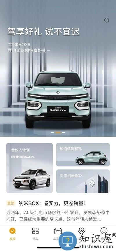 选车:可以全面了解东风纳米汽车产品优点,进行线上预约试驾,在线购买个性化配置的爱车。