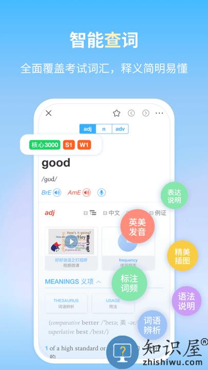 标注词频:分级标记“朗文交际9000词”及口语、书面语常用3000词,核心3000词与初高中新课标词汇高度重合,市面唯一对口语、书面语核心词汇进行分级的词典品牌;