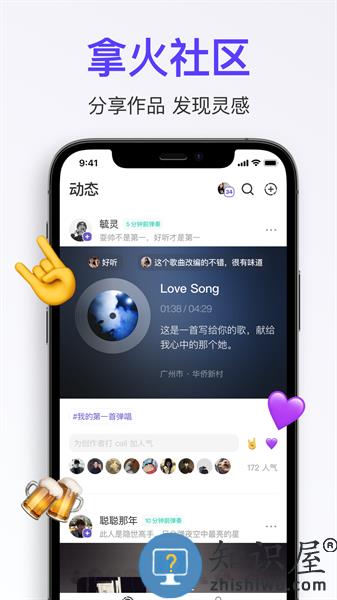 2、【拿火社区】与拿火小伙伴在线,火爆社区,一键发布演奏视频,打造专属于你的吉他音乐朋友圈,弹自己的琴,让别人尽情羡慕吧。