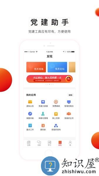 “支部工作”APP分为信息、互动、学习、管理、个人等五大板块。