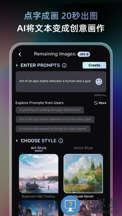 导入一张图片,ai就能把这张图转化为任何你想要的风格画作。想象一下,将自拍照变成任意动漫的2265主角不再需要垫图手绘。不需要画笔,使用丰富的想像力,就能得到一副细腻又艺术的画作。