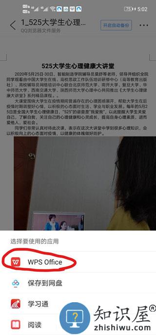 选择了其他应用打开后,会弹出选择要使用的应用,选择wps Office(此操作需用到手机版WPS,若没有下载,在手机应用里可以找到)。