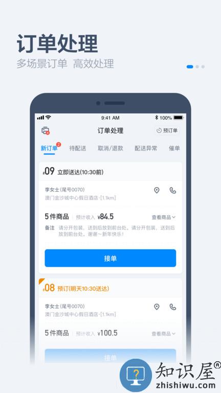 4.保障全。配送信息实时同步用户端和商户端;咨询、投诉、赔偿标准与流程与平台配送保持一致,均由平台客服承接