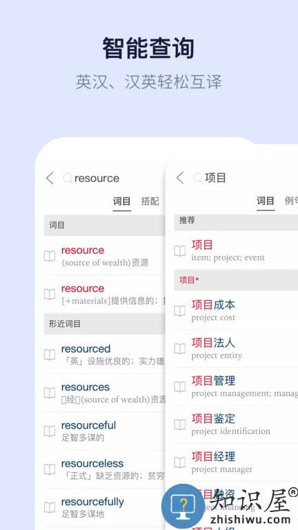 查词方便快捷:英汉、汉英双向查询,短语、搭配、例句等相关内容都能智能检索。