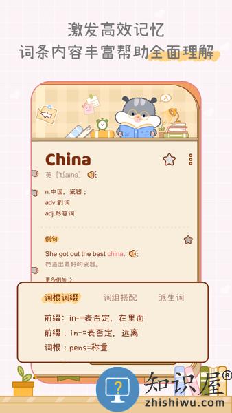 奶酪单词软件内置小学到大学到出国的所有英语词汇,内置一个专业的英语单词记忆计划,萌萌的ui设计,还有一个小仓鼠陪伴着您,您的努力与付出将会为仓鼠增添更多的家居!