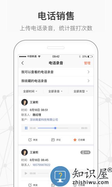 - 电话销售管理:PC端一键拨号、电话录音、电话数据统计、电话排行榜、客户跟进计划,让CRM与电话机完美结合,帮助企业掌握员工通话数据,优化沟通话术,提升销售业绩