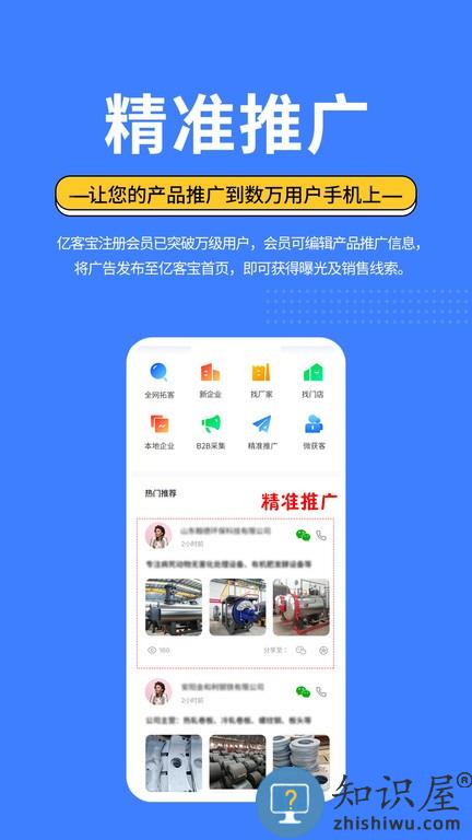 精准推广:注册会员已突破万级用户,会员可编辑产品推广信息,将广告发布至亿客宝首页,即可获得曝光及销售线索。