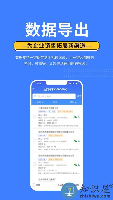 数据导出:支持一键保存到手机通讯录,可一键添加微信、抖音、微博等,让您灵活运用网销拓客。