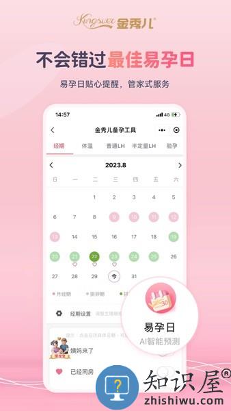 金秀儿app今天帮助您智能预测排卵峰值,无需手动记录,不用纠结颜色深浅,为您提供易孕日贴心提醒,还有孕周变化孕产期计算工具,专业的姐妹树洞专家科普,祝你好孕!
