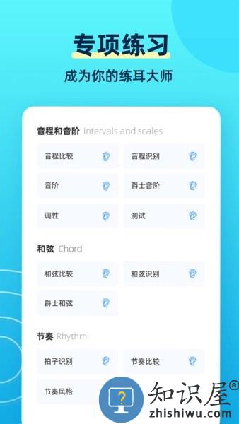 专注于耳朵的练习、声音的训练、乐理的掌握和系统的学习;更涵盖了音程与音阶、和弦、音高与旋律、和声与曲式、音乐元素、节奏、曲目等视唱练耳练习题,多种练习科目,丰富你的视唱练耳世界,提高视唱练耳水平;