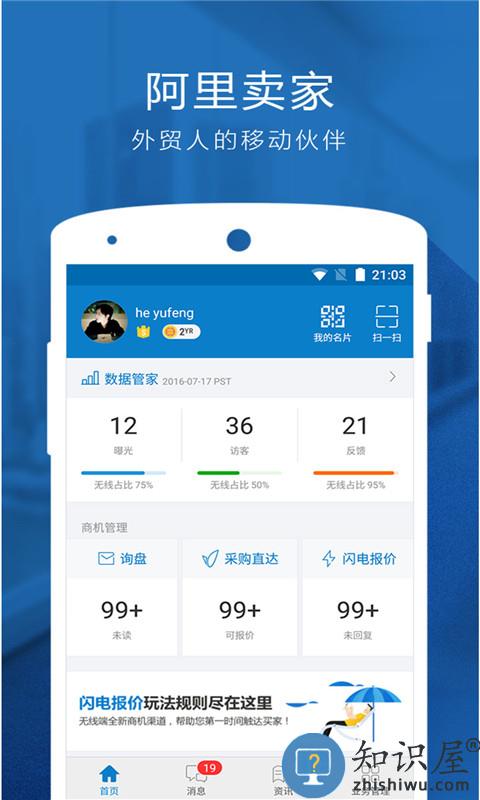 融合了阿里旺旺、外贸邮等功能的阿里卖家APP,实现询盘、采购直达、闪电报价等不同形式客户商机的集中管理,并通过消息提醒助手,实时掌握最新动态;