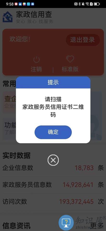 消费者可通过家政信用查APP浏览家政行业各类资讯信息,可查询浏览家政企业公开信用信息,注册、登录后可通过扫描二维码(见家政服务员信用查询证书),经授权查看家政服务人员信用信息。