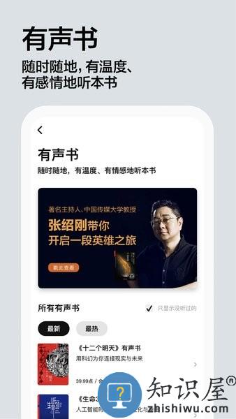 2.有声书:邀请张绍刚、郎永淳、李小萌、毛大庆、何帆、冷爱等大咖为您朗读《先发影响力》《牛奶可乐经济学》《深夜加油站遇见苏格拉底》《千面英雄》《幸福的婚姻》……经管书籍也可以随时随地用耳朵阅读