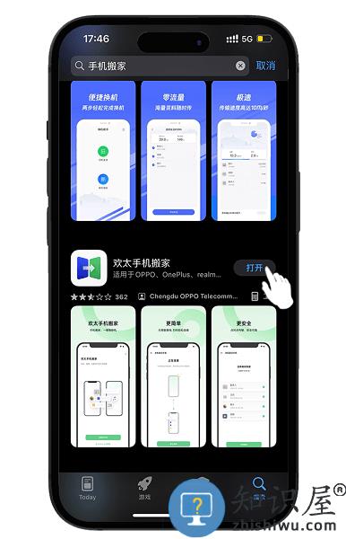 2、 旧手机进入APP Store,搜索‘欢太手机搬家’(其他搬家软件有风险,请注意软件名称),点击安装;