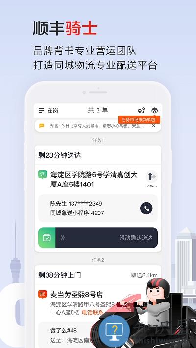顺丰骑士员工版本是专为顺丰物流的快递员们特别准备的员工自助手机应用软件,拥有十分强大的应用功能,帮助骑士们更好的获取订单信息,随时随地在线接单,还能与同事们更好的沟通交流哦!快来点击下载体验一下吧!