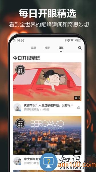 开眼eyepetizer软件是小编自用的一个超有创意的短视频应用,它能够为设计师提供灵感,为学生提供学习的氛围,为沮丧者提供励志的动力,每天都会精选推荐一个创意的集锦,让你大开眼界!