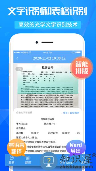 通过OCR文字识别技术自动识别、提取图片文字 ,解析信息;它能够读取相机或者图库中的图片,智能裁剪图片,快速进行文字提取,然后自动图片转文字,支持word和txt文档导出分享。