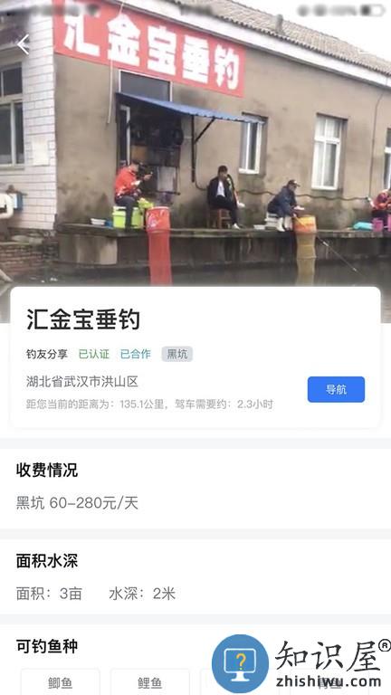 包含钓点环境、是否收费,道路路书、水深竿长、一键导航等功能。
