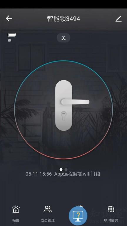 智洲怡家app能够用手机控制家里的智能锁,支持远程开门,能够授权给其他的家庭成员,还能生成临时密码,支持进行报警设置,有异常时手机会及时接收到消息,能够查看历史的开门记录以及门锁的剩余电量。