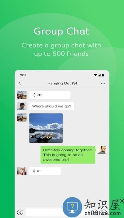【丰富的聊天方式】支持视频、图片、文本、语音、地理位置等方式与好友聊天互动。单聊不够爽还可以组建高达500人的群聊。