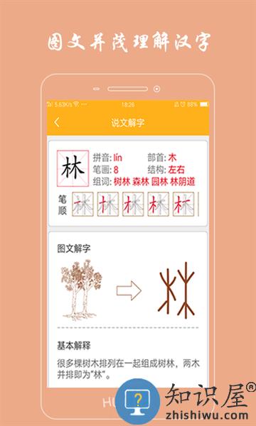 1、在线即可了解汉字的相关知识,通过分类详细的进行展示,让学生充分了解该汉字;