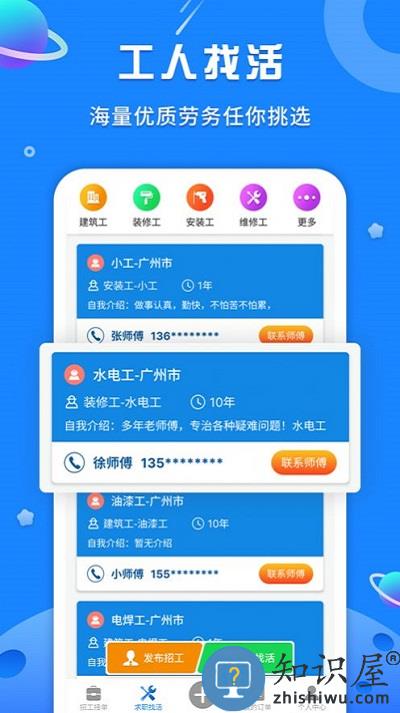 2.APP精准匹配老板与工人信息,随时随地查看联系,在线就能完成招工找活。