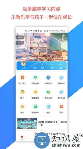 3、学生和家长可以利用乐教乐学进行游戏化学习;完成作业;进行教材同步练习;参与活动;展示才艺;了解孩子学习情况;了解学校、班级动态;亲子互动学习等功能。