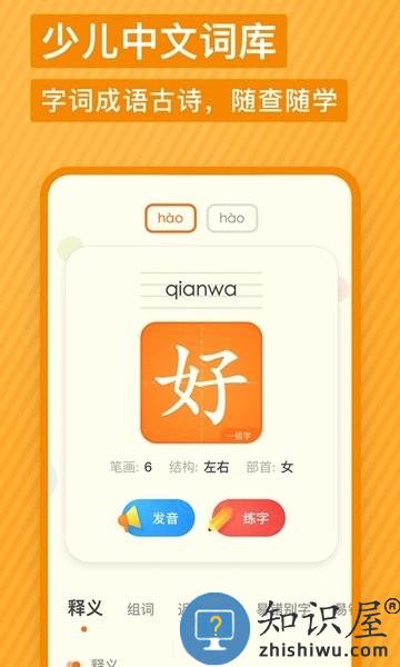 * 汉字笔顺:汉字全部配置笔顺动图及跟写练习,并为每一个汉字录入真人发音,为儿童带来多感官学习体验。