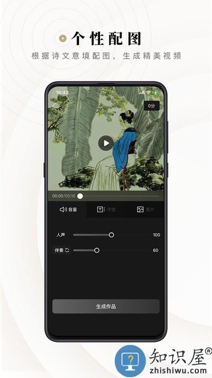【一键生成】录音完成后,可一键生成带有配图配乐的视频作品.图片、背景音乐可自由切换选择.